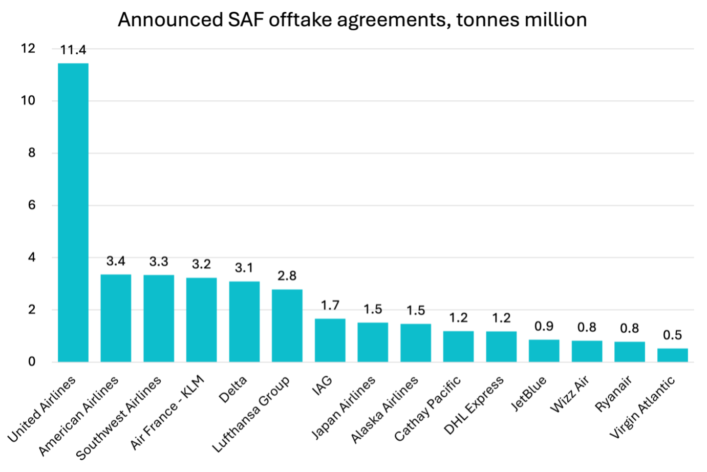United Airlines comes out as having made by far the largest commitment to SAF, using this measure.I will say that a lot of this is due to the announced agreements being unusually long on duration (averaging 15 years on a volume weighted basis, over twice the average duration in the whole data set). Many of United’s announcements give volume figures using “up to” language, suggesting quite a few get out clauses over the 20-year period of some of these agreements. Having said that, even adjusting for duration, United would probably still be number one in terms of announced SAF offtake volumes.
